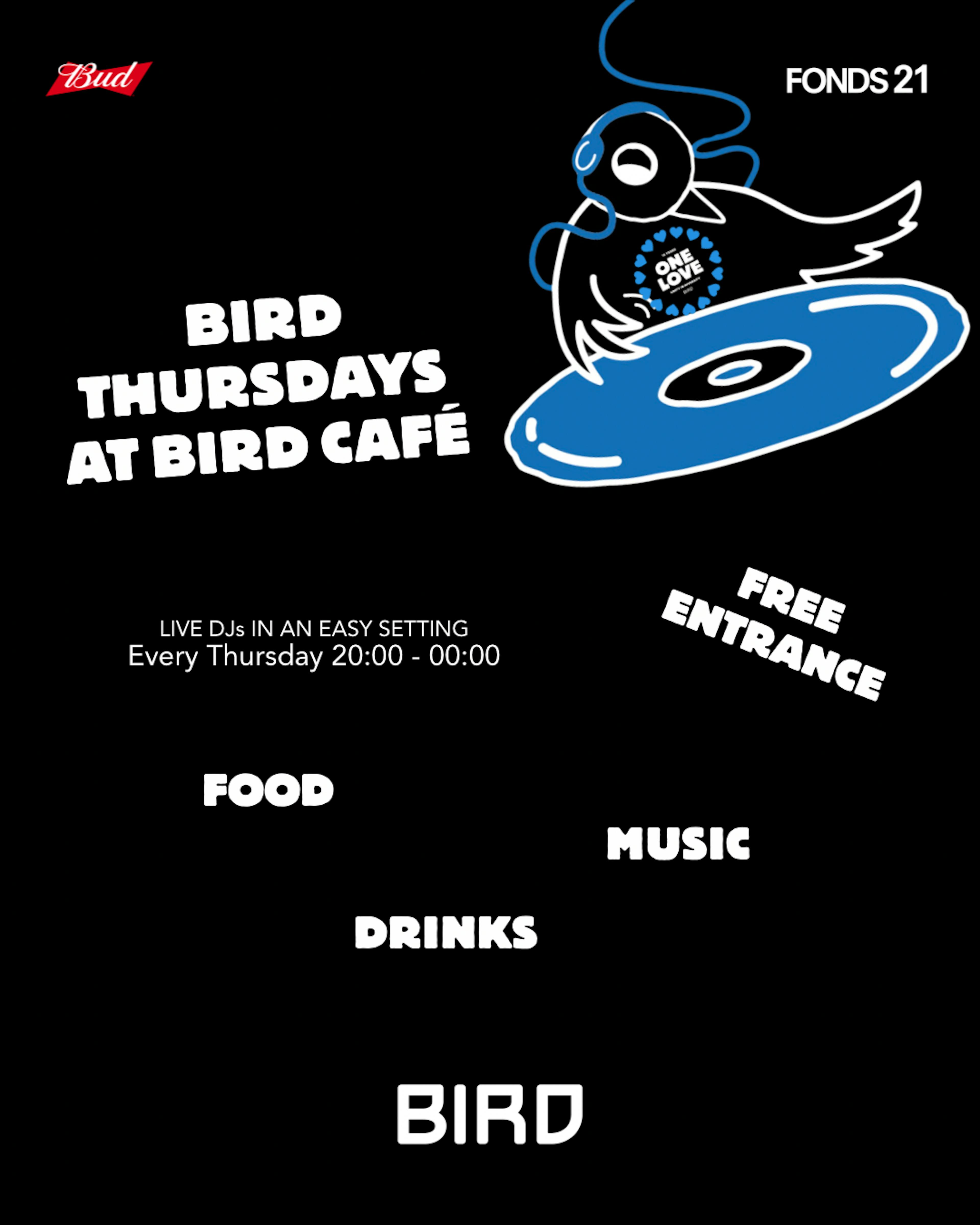Elke donderdagavond is BIRD Café onze plek plek om samen te komen. Of je nu net uit werk komt, zin hebt in goede muziek, een hap wil eten of onverwacht toch even wil dansen, dit is waar het gebeurt.