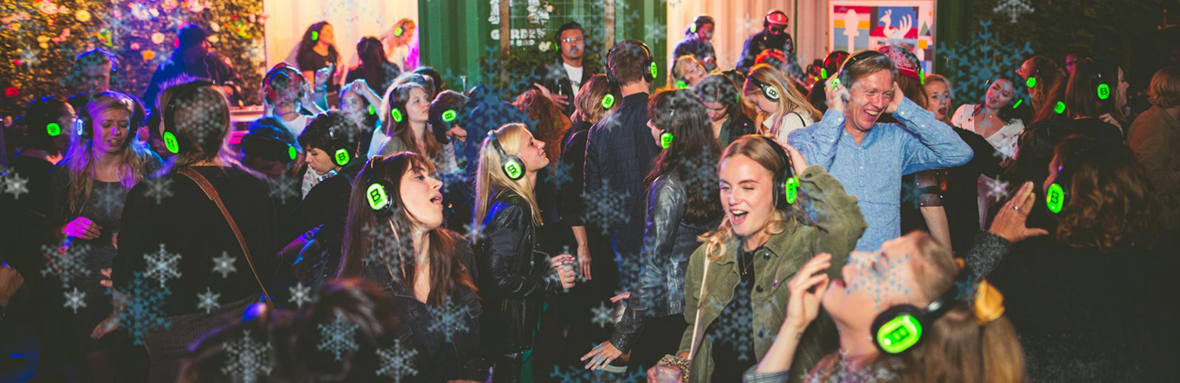 € 12,- (Silent Disco) € 76.50,- (Silent Disco + X-mas Dinner) € 92,- (Silent Disco + X-mas Dinner + wijnarrangement)