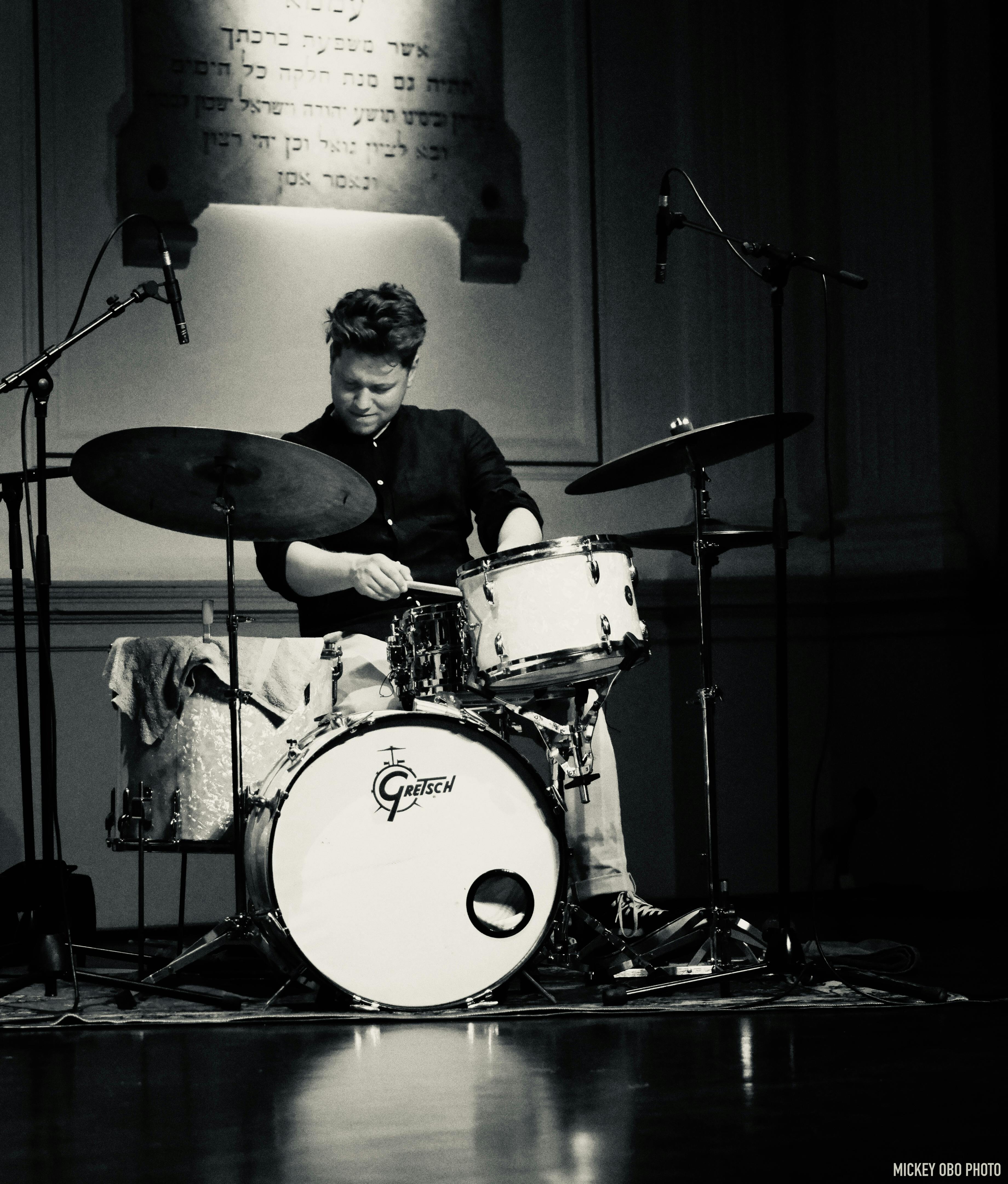 Hij leidt de band vanachter het drumstel: open, ritmisch en met veel ruimte om te spelen. Alles draait om luisteren, reageren en elkaar pushen.